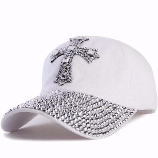 Rhinestone Baseball Cap with Cross - White