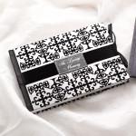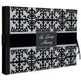 Give or use this guest book for a memorial or funeral to commemorate the life of a dear loved one and celebrate the memory of lives touched and changed by them. The cover has a black flocked design over silver, trimmed in silken black and finished with an silver foiled center overlay. A black ribbon creates the closure.