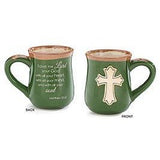 One 18 oz hand-painted olive green and tan porcelain mug with a raised cross on the front and "Love the Lord your God with all your heart, with all your mind, and with all your soul Matthew 22:37" message on back.