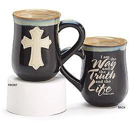 One stunning 18 oz black porcelain mug with tan trim on rim and mug handle. On front of mug is a raised cross. Back message reads, "I am the Way and the Truth and the Life. John 14:6."