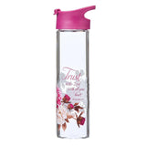 This glass water bottle, with its delicate plum-colored rose design, is not just lovely to look at; it holds words of inspiration and peace. Proverbs 3:5, "Trust in the Lord with all your heart," is written in plum-colored cursive, with the word "Trust" in a larger print to emphasize the significance of this Christian virtue. Delicate roses detail the lefthand edge of the Bible verse and spread around the bottle's middle to provide loveliness from every visual angle.